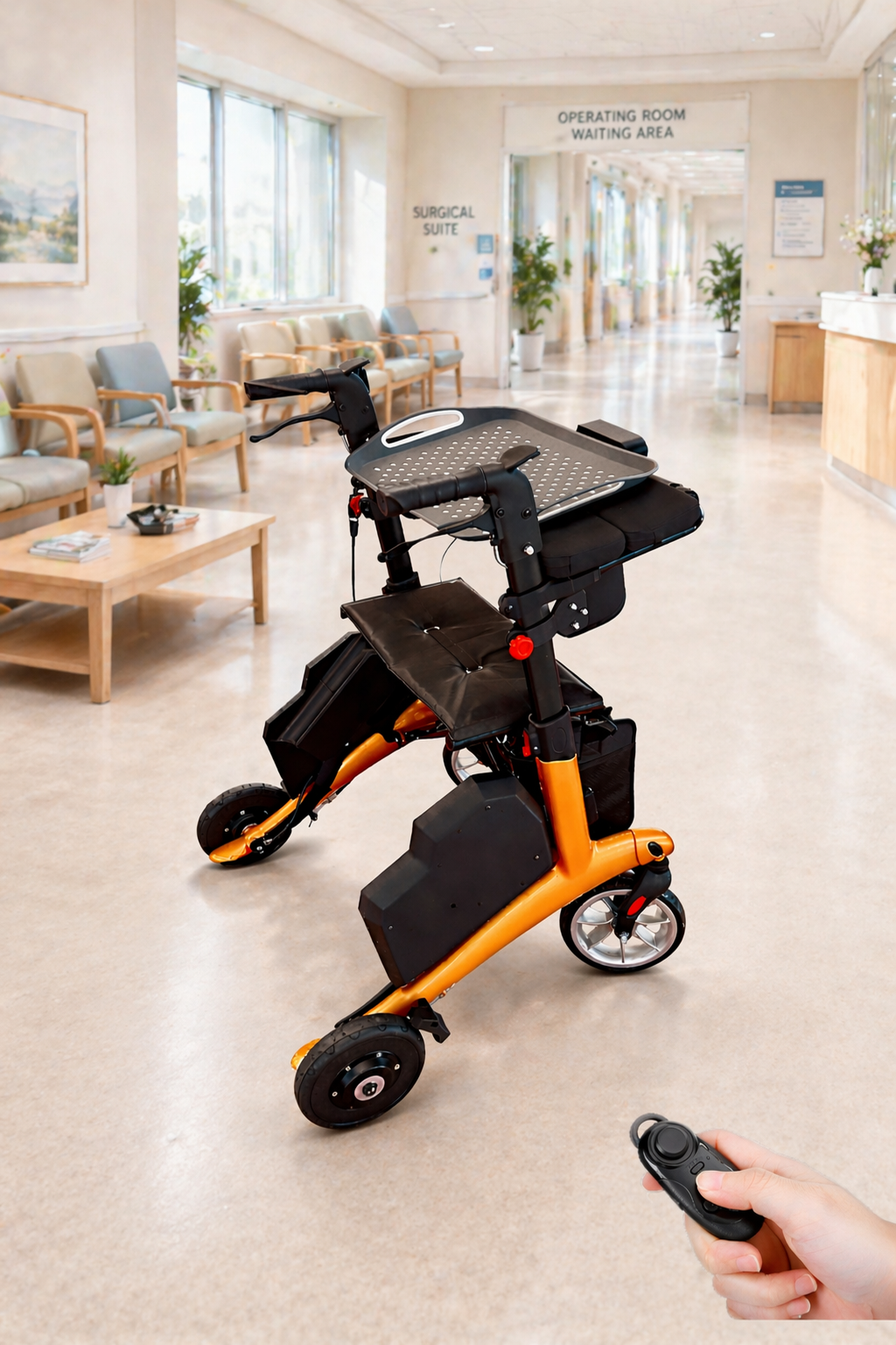 This product allows a user to summon the rollator via a remote controller and even use it as a food-carrying robot.